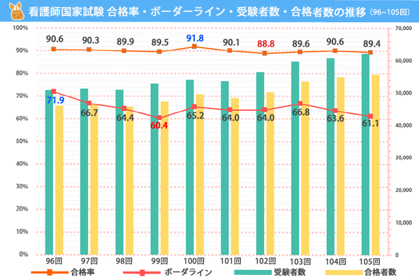 上のパーセントは既卒の看護師国家試験の合格率になります。