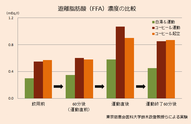 茶色とオレンジ色はコーヒー(カフェイン)を摂取した時の遊離脂肪酸濃度(FFA)です。コーヒーを飲んだグループの数値が高いことが分かりますね!値が高い=身体に蓄えられた脂肪を分解しているという解釈でいいと思います♪