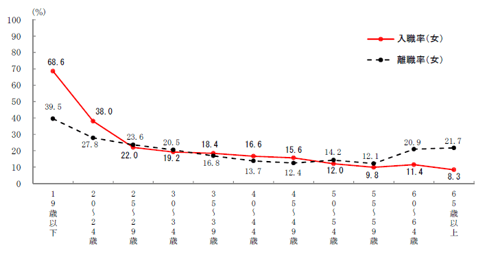年齢階級別入職率・離職率(女)